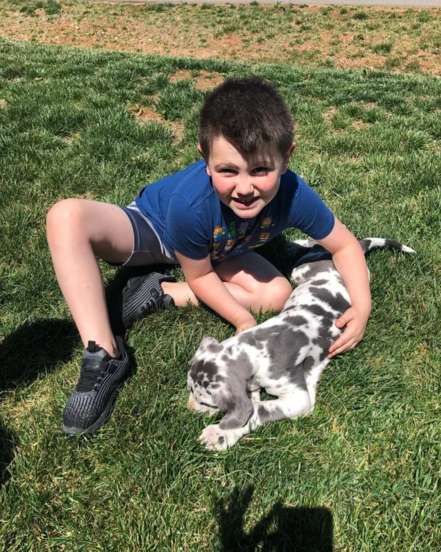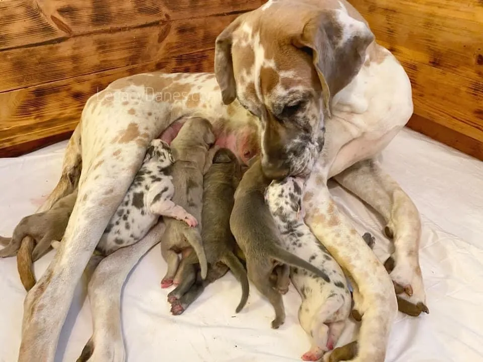 We implement a hands-on, ethical approach to Great Dane breeding. For example, we introduce each puppy to household routines from day one, fostering confidence and adaptability. This process involves gentle handling, sound desensitization, and interactions with children and other pets.